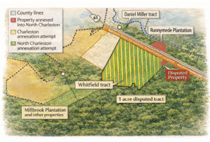 • North Charleston’s 2017 annexations: In October 2017, North Charleston annexed a larger tract known as Runnymede on the northeast side of Highway 61. In December 2017, City Council adopted Ordinance No. 2017-080 to annex a separate one-acre parcel on the southwest side of Highway 61—but that acre does not touch Highway 61. It sits across the National Trust’s 100-foot strip.
