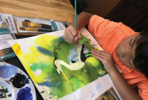 Nico, who will be entering the 5th grade at Ashley River Creative Arts Elementary School, used a mixed media technique that involved sketching the heron with a pencil and then layering tie-die inks, paints, and transparencies. It took him four days to finish the piece, but the end result was well worth it.