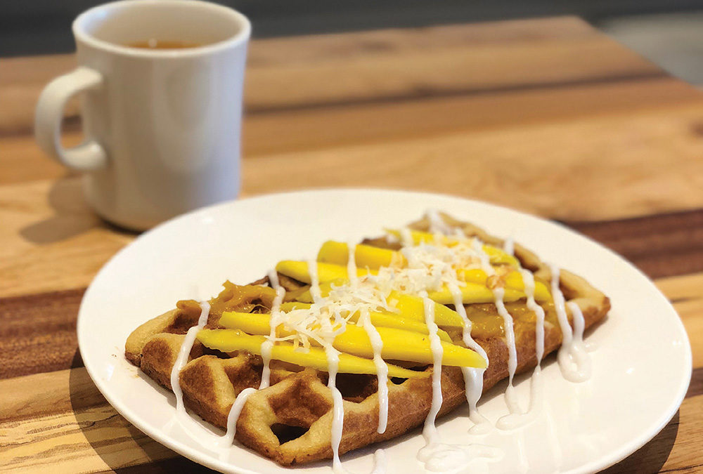 On the sweet side there is a traditional Maple Glaze waffle, served with real maple syrup. There’s also a Cinnamon Apple waffle, which consists of a cinnamon apple compote and vanilla sauce. There’s a Mango Coconut waffle, which is inspired by the Thai dessert favorite mango sticky rice. The waffle version is topped with fresh mango, coconut drizzle, and toasted coconut flakes. There’s also a Peanut Butter Banana waffle, topped with organic peanut butter, banana, honey, and toasted pecans.