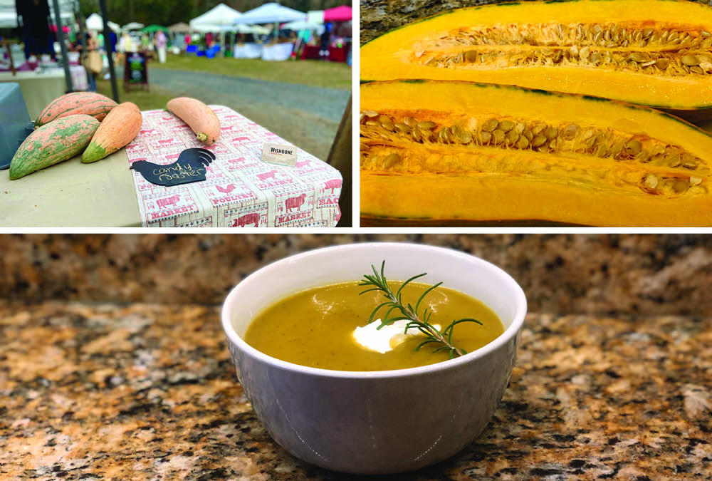 Since January is generally the coldest month in the Palmetto State, let’s start with a soup. On a recent visit to the Sea Island Farmers Market on Johns Island, my eye was drawn to a farm stand with fruit that looked like it had fallen straight from the pages of a Dr. Seuss book. David from Wishbone Heritage Farms in St George explained that they were candy roaster squash.
